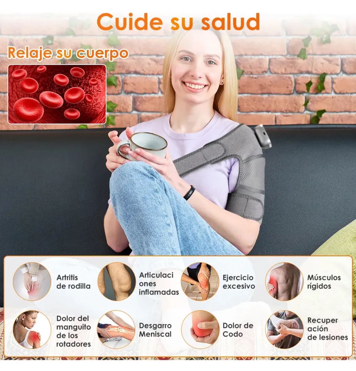 Con 3 niveles de vibración y 5 niveles de temperatura, puedes personalizar cada sesión según tus necesidades, ya sea después del ejercicio, una jornada larga o simplemente para relajarte. Su ajuste con velcro permite un uso cómodo y seguro, y su diseño multifuncional hace posible utilizarla también en hombros, codos, piernas y tobillos.